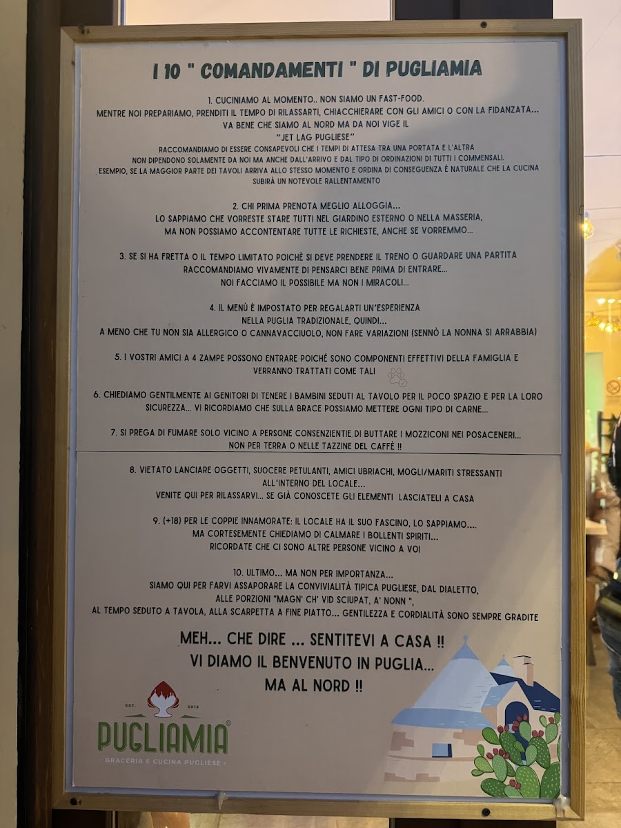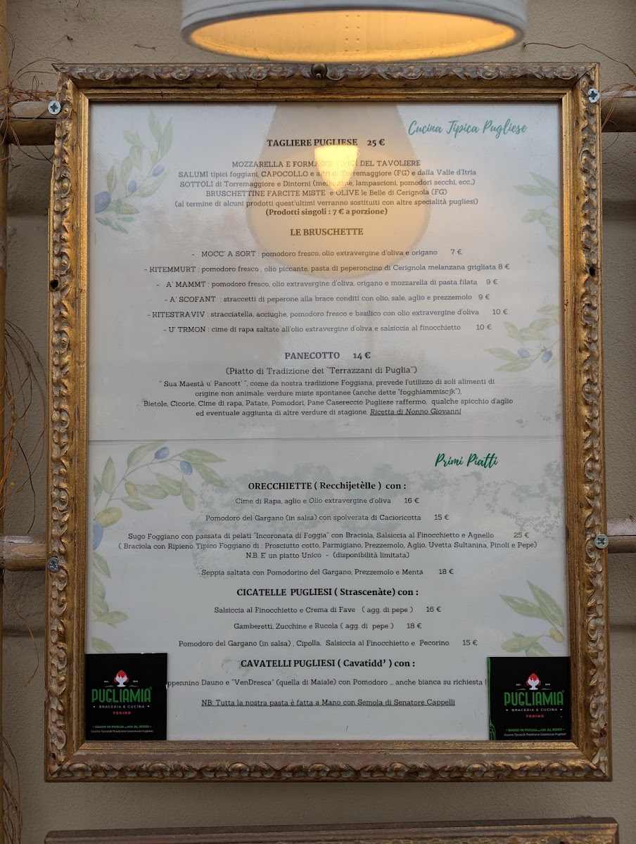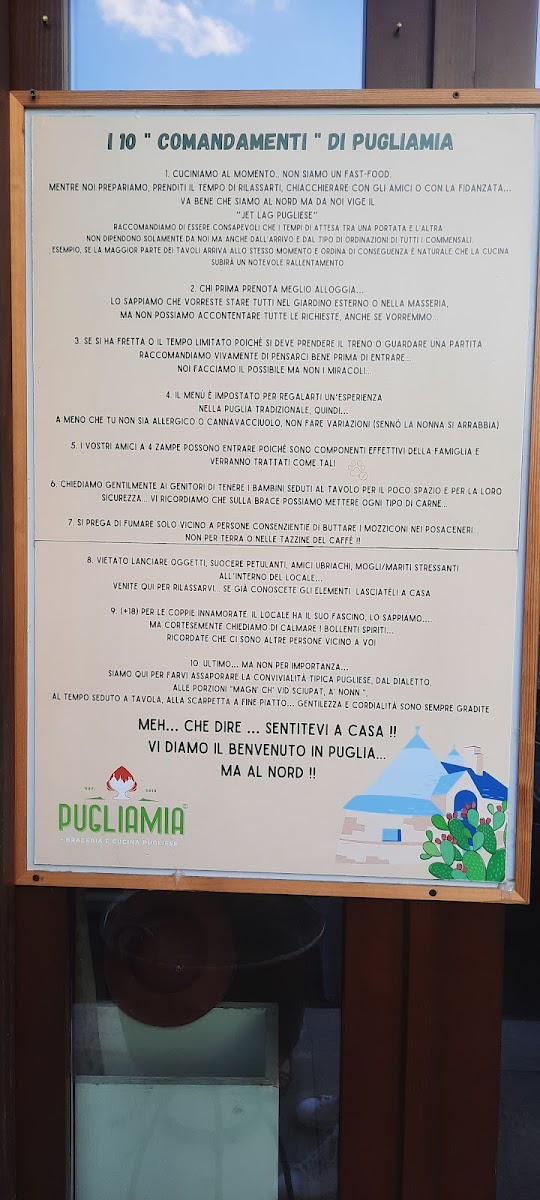 The menu at PugliaMia Torino Braceria e Bottega features a variety of traditional dishes from the Puglia region, with a focus on grilled specialties and regional flavors. The offerings are organized into several categories that showcase both main courses and complementary items.